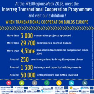 Este año, la Semana Europea de las Regiones y Ciudades tendrá lugar del 8 al 11 de Octubre en Bruselas. Los participantes podrán visitar una exposición sobre los programas Interreg transnacionales, #MadeWithInterreg, reflexionar sobre el futuro de la cooperación europea en nuestro laboratorio de ideas y apoyar al proyecto Sudoe ClimACT en la ceremonia de los Regiostars y el Slam organizado por Interact.