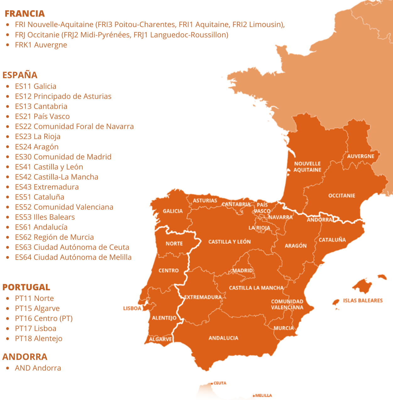 El área geográfica de Sudoe comprende 26 regiones y ciudades autónomas (NUTS II) de 4 Estados: 3 Estados miembros de la Unión Europea y 1 tercer país.