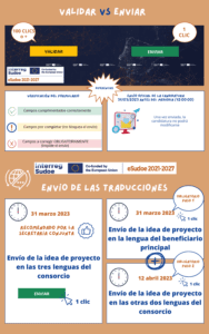 Debido a que el jueves 6 de abril, viernes 7 de abril y lunes 10 de abril son días festivos en los países miembros del Programa Interreg Sudoe, la fecha de presentación de las traducciones de las candidaturas de proyectos, inicialmente prevista para el viernes 7 de abril antes del mediodía, 12:00:00 h. (hora local Santander, España peninsular), se pospone para el miércoles 12 de abril de 2023 antes del mediodía, 12:00:00 h. (hora local de Santander, España peninsular).