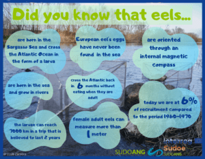 SUDOANG trata de fomentar la protección de las anguilas europeas a través de acciones de sensibilización y mejorar su stock. En estos últimos meses, el proyecto se ha enfocado a la creación de escenarios de gestión que serán recogidos en su página web. Uno de los puntos claves para la creación de dichos escenarios es entender los modelos GEREM y EDA que permiten predecir el reclutamiento de anguilas y su densidad. En este sentido, para guiar a los distintos actores claves en cuanto a su uso, el proyecto ha puesto a disposición un video explicativo, el modelo EDA para dummies. Este video está disponible en youtube en español (https://www.youtube.com/watch?v=_LkFDgtybog), inglés (https://www.youtube.com/watch?v=uS5sehcH7Uc), portugués (https://www.youtube.com/watch?v=HPfAmMKV2kQ&t=1s) y francés (https://www.youtube.com/watch?v=jSza0eQgpA0).
