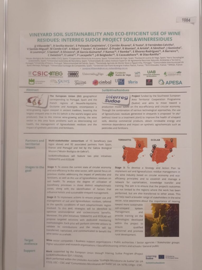 El miércoles 10 de septiembre, investigadores de las Unidades Asociadas grupo BCS de MBG-CSIC Santiago y UVigo y USC presentaron el proyecto Soil&WineResidues en el stand de la Sociedad Española de la Ciencia del Suelo, durante el congreso EUROSOIL 2025, celebrado en Sevilla.