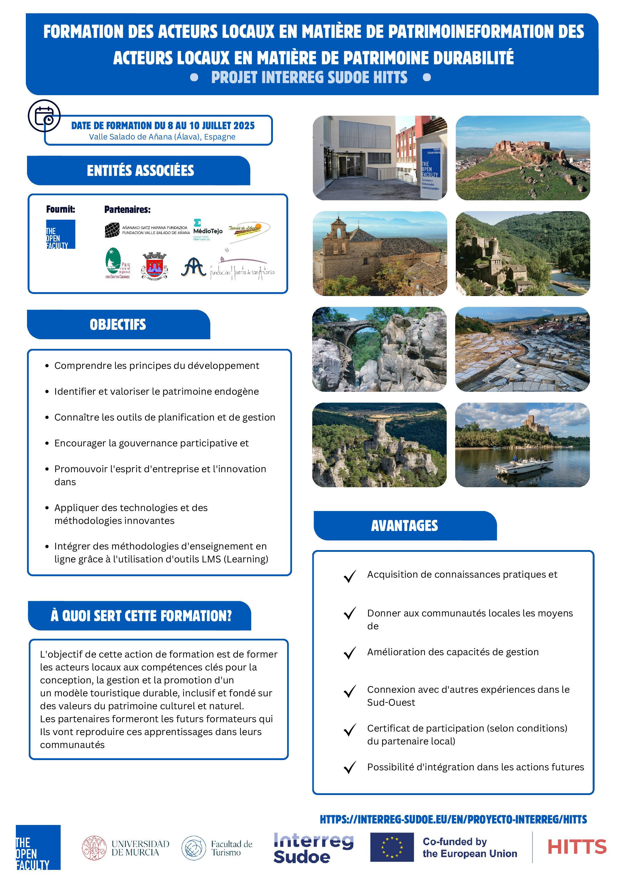 La Vallée Salée d’Añana (Pays basque – Espagne) accueillera, du 8 au 10 juillet 2025, un cours intensif destiné à former les acteurs locaux au tourisme durable, à la valorisation du patrimoine et à l’utilisation d’outils de planification innovants. Cette formation s’inscrit dans le cadre de l’activité A2.1 du projet Interreg Sudoe HITTS, axée sur la formation et l’accompagnement des acteurs locaux.