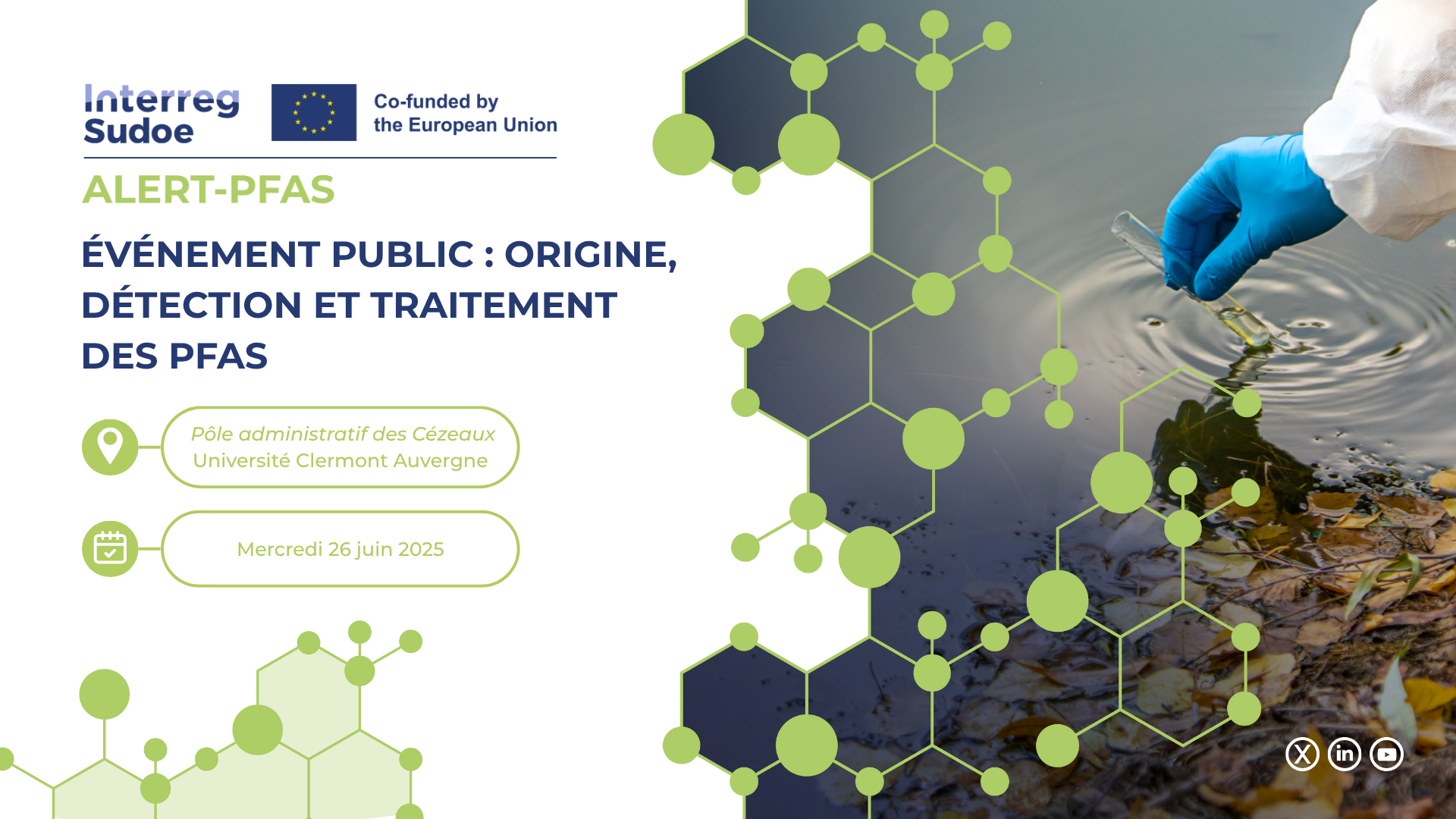 El jueves 26 de junio, la Universidad Clermont Auvergne acogerá un taller técnico internacional en el marco del proyecto europeo Interreg SUDOE ALERT-PFAS. El evento tendrá lugar de 14:00 a 17:00 h en el Pôle administratif des Cézeaux (1, place Vasarely, 63178 Aubière Cedex, Francia) y reunirá a los principales actores de la gestión del agua, la protección ambiental y la intervención de emergencias.