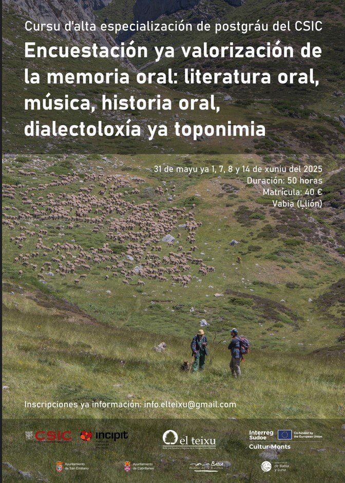 El INCIPIT-CSIC organiza, junto con la asociación El Teixu y la Rede pal Estudiu y Defensa de la Llingua Asturllionesa, un curso de alta especialización de postgrado titulado “Encuestación y valorización de la memoria oral: literatura oral, música, historia oral, dialectología y toponimia”.