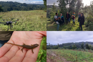 En octubre se visitó la parcela experimental en Mariñas-Betanzos donde, gracias a la utilización de un dron, se obtuvo una foto aérea actualizada de la finca para poder hacer así un levantamiento cartográfico que representa la situación actual del viñedo. Se realizó también un nuevo reconocimiento de la finca para poner en común las ideas de intervención y se visitaron rincones históricos de la finca de Pagos de Brigante. Además de observar parte de la fauna que convive en el viñedo, se pudo identificar la salida de agua y la charca existente, que serán objeto de mejora en el proyecto a través de la retirada de especies invasoras y la recuperación de la fuente histórica que da nombre al paraje -A Picha-. La plantación de especies autóctonas en el entorno de la charca permitirá potenciar el servicio ecosistémico de refugio y alimento para la fauna, aumentando la biodiversidad en el entorno.