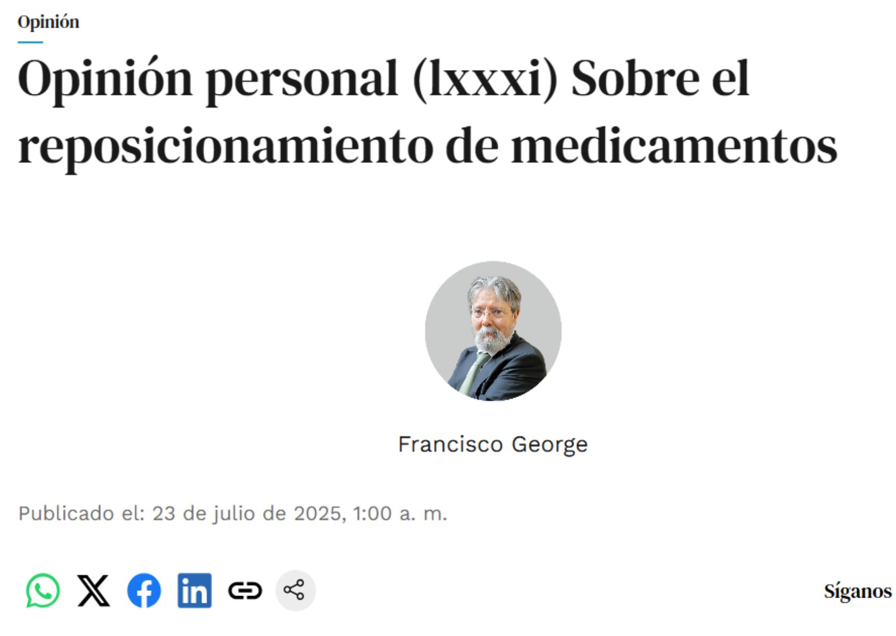 En su texto, George recuerda cómo medicamentos tan conocidos como la aspirina o el viagra cambiaron por completo su propósito inicial gracias a nuevos descubrimientos científicos. Estos ejemplos ilustran cómo el reposicionamiento permite aprovechar compuestos ya existentes para nuevas aplicaciones terapéuticas, evitando partir desde cero en el proceso de desarrollo y aprobación.