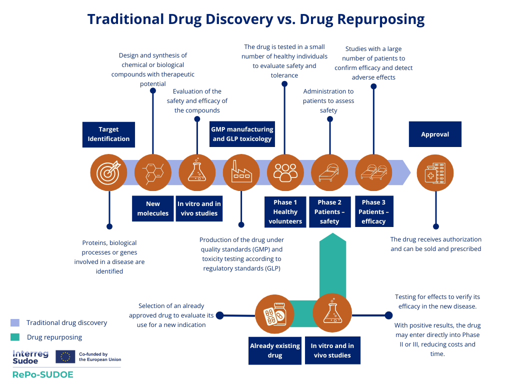 De esta manera, el drug repurposing posibilita saltarse las fases iniciales del desarrollo clínico y los ensayos clínicos de fase I. Con esta estrategia, tras los estudios in-vitro e in-vivo, se accede directamente a los estudios clínicos de fase II donde el tratamiento en pacientes de seguridad confirmará o no la eficacia terapéutica.