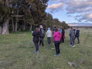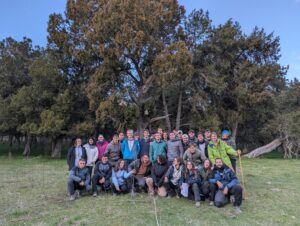 La jornada de campo abarcó todos los aspectos de funcionamiento de un sabinar en diferentes espacios de la provincia de Soria, desde la repoblación hasta la visita al bosque maduro de sabina albar (Juniperus spp.). La actividad comenzó en la pedanía de Alcozar (Langa de Duero), donde la asociación forestal ha promovido una repoblación. En este espacio se mostró a los alumnos de la UPV las tareas realizadas en cuanto a plantación en terrenos muy degradados y susceptibles de sufrir erosión. El grupo se trasladó posteriormente hasta el sabinar ubicado en el paraje Campoespacio de Abejar para profundizar en los tratamientos selvícolas de acondicionamiento de la masa forestal y su preparación para un uso más ganadero. Finalmente, se visitó el Sabinar de Calatañazor. Esta reserva natural acoge algunos de los ejemplares más longevos y elevados de esta especie de la península ibérica. La jornada de campo estuvo guiada por técnicos de ASFOSO y en ella también participó el catedrático de la UPV y miembro investigador de SocialForest Antonio del Campo.