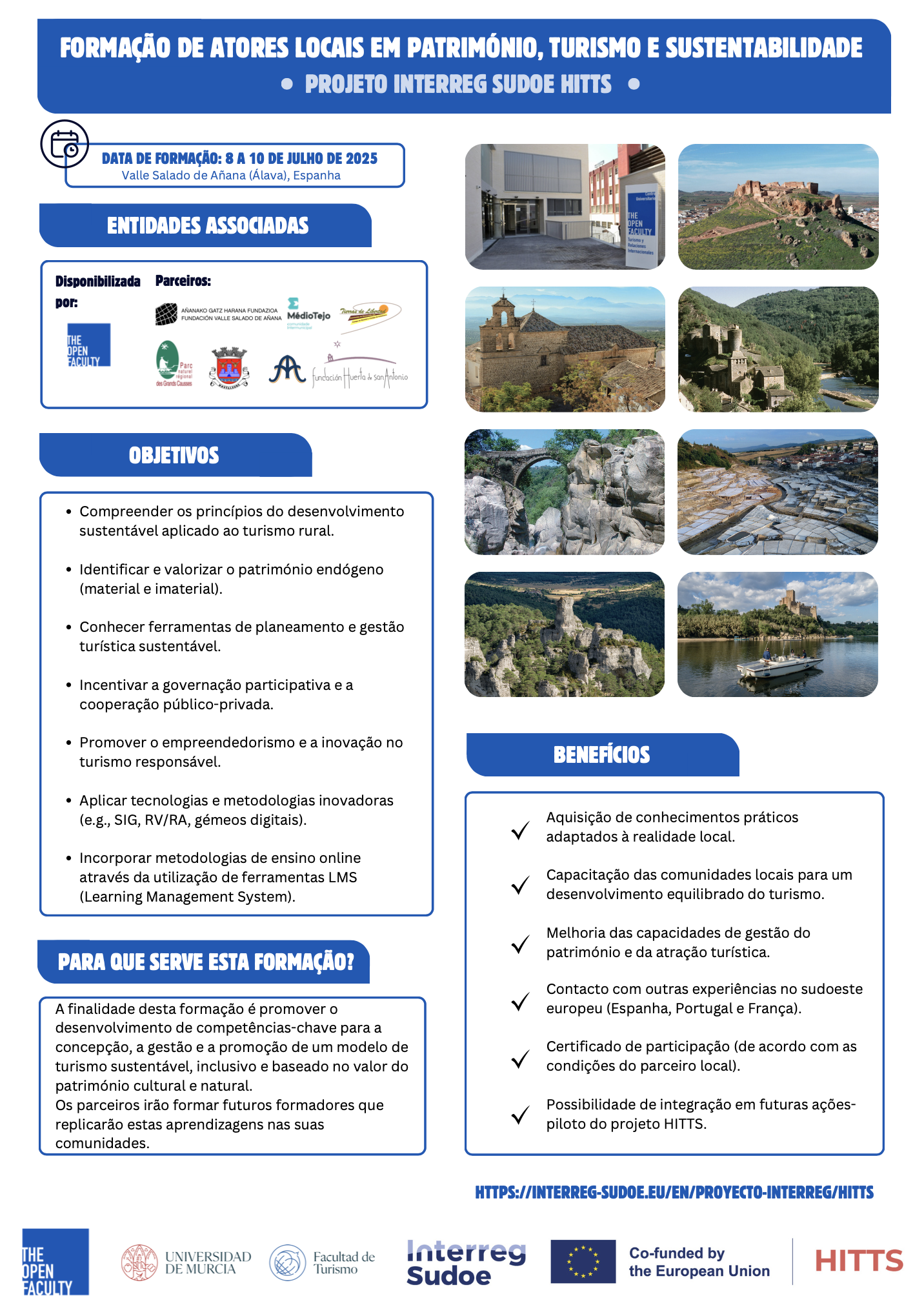 O Vale Salgado de Añana (País Basco – Espanha) acolherá, de 8 a 10 de julho de 2025, um curso intensivo destinado a capacitar atores locais em turismo sustentável, valorização patrimonial e ferramentas de planeamento inovadoras. Esta formação insere-se na atividade A2.1 do projeto Interreg Sudoe HITTS, centrada na formação e acompanhamento de atores locais.