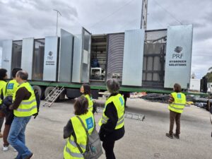 Ainda no âmbito da 3.ª reunião de parceiros, na manhã do dia 27 de março, foi organizada uma visita técnica à empresa PRF – Gás, Tecnologia e Construção. Sendo esta uma empresa líder no setor do Gás Natural e Hidrogénio, durante a visita foram apresentados e debatidos casos práticos de utilização do hidrogénio em contexto real, tendo tido, os parceiros do projeto, a oportunidade de ver in loco, a produção de equipamentos para utilização de hidrogénio, nomeadamente estações de abastecimento de hidrogénio, entre as quais se destaca a estação móvel de abastecimento de hidrogénio (PHRS – Portable Hydrogen Refueling Station).