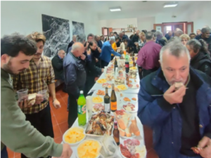 Refeição comunitária à volta de pão feito em Extremo e baile com música tradicional. No âmbito do processo de interação com a comunidade local, realizou-se um almoço comunitário entre investigadores, professores, alunos, agentes locais e habitantes de Extremo, com o objetivo de estabelecer laços de cooperação, reforçar os processos de co-construção de conhecimento e encontrar ligações entre os diferentes agentes que trabalham o património. Esta refeição decorreu também na sede da Junta de Freguesia e incluiu uma degustação de pão confeccionado na padaria de Extremo, o último elo do ciclo do pão que faz parte da valorização proposta pela Cultur-Monts na montra portuguesa.